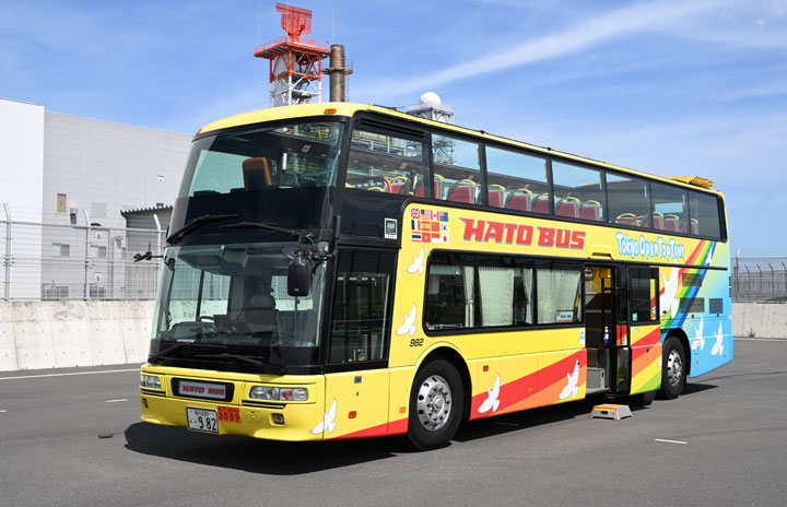 空港内専用ナンバープレートを取得した羽田空港の制限区域内を走行するはとバスのオープントップバス=22年6月24日 PHOTO: Tadayuki YOSHIKAWA/Aviation Wire