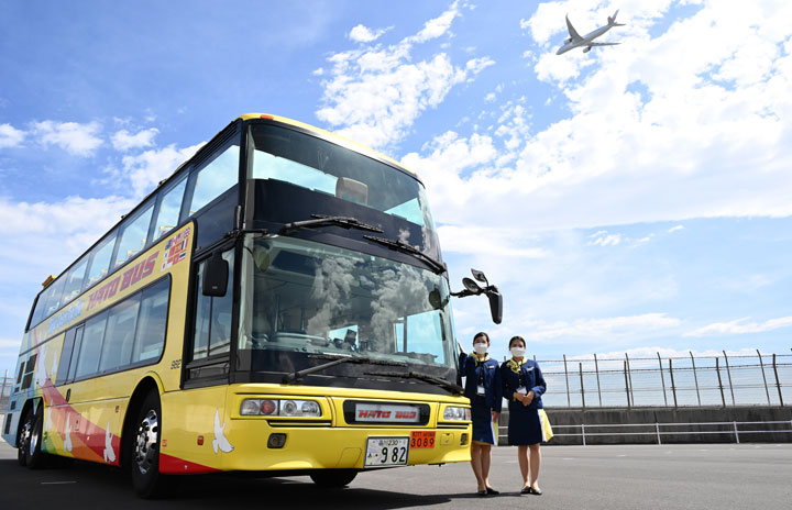 羽田空港の制限区域内を走行するはとバスのオープントップバスを紹介するバスガイド=22年6月24日 PHOTO: Tadayuki YOSHIKAWA/Aviation Wire