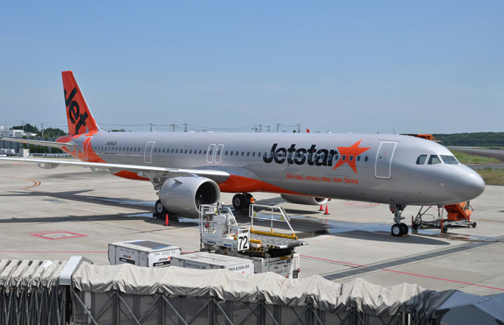 成田空港で出発を待つジェットスター・ジャパンのA321LR初号機=22年6月30日 PHOTO: Tadayuki YOSHIKAWA/Aviation Wire