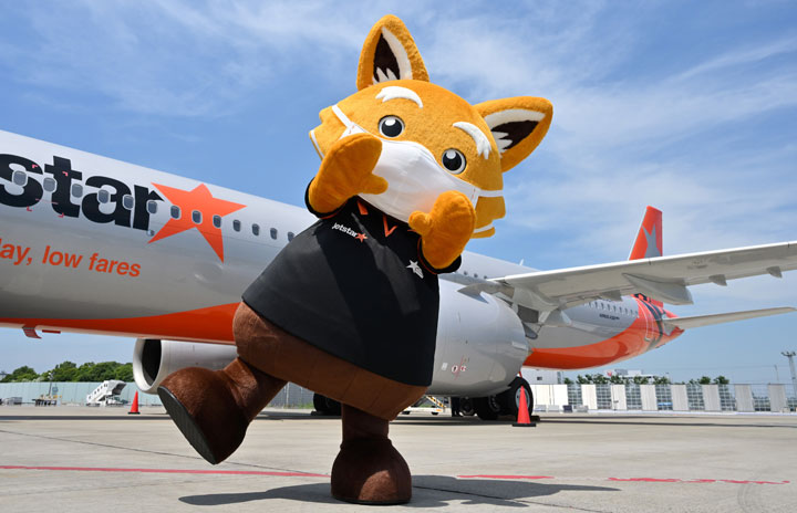 成田空港でジェットスター・ジャパンのA321LRチャーターの参加者を出迎えるマスコットのジェッ太=22年6月30日 PHOTO: Tadayuki YOSHIKAWA/Aviation Wire