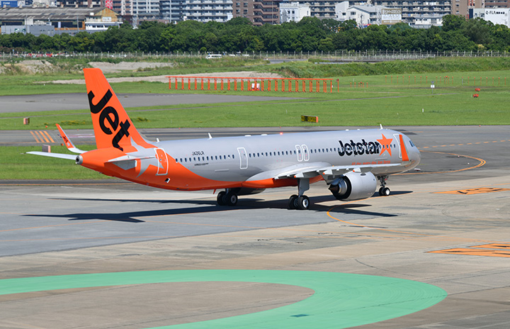 福岡空港に着陸し4番駐機場へ向かうジェットスター・ジャパンのA321LR初便となった成田発GK503便=22年7月1日 PHOTO: Yusuke KOHASE/Aviation Wire