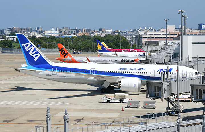 福岡空港で出発を待つジェットスター・ジャパンのA321LR(中央)=22年7月1日 PHOTO: Yusuke KOHASE/Aviation Wire
