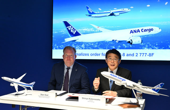 ファンボロー航空ショーで開かれた777-8Fと737-8の調印式で挨拶するANAホールディングスの片野坂真哉会長(右)=22年7月18日 PHOTO: Tadayuki YOSHIKAWA/Aviation Wire