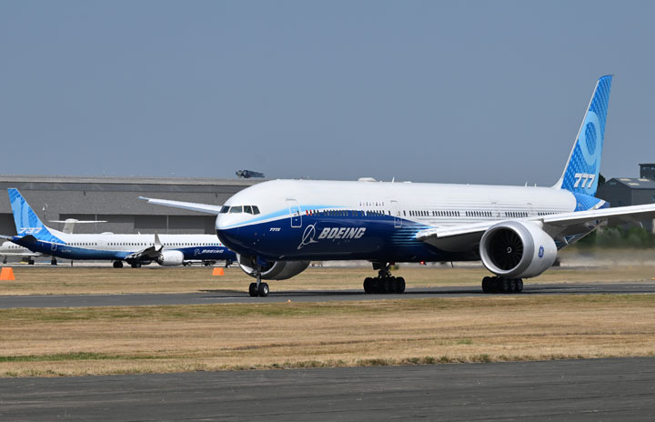 ファンボロー航空ショーで飛行展示に向けて離陸する777-9(右)と離陸の順番を待つ737-10=22年7月18日 PHOTO: Tadayuki YOSHIKAWA/Aviation Wire