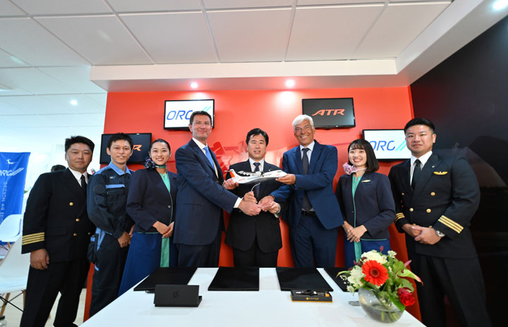 ファンボロー航空ショーでATR42導入と整備契約を締結するORCの田中和史専務(中央)とATRのステファノ・ボルトリCEO(中央左)ら=22年7月19日 PHOTO: Tadayuki YOSHIKAWA/Aviation Wire