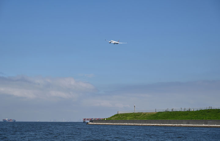 「屋形船de航空教室」の船上から見た羽田空港を離陸するJALのA350-900=22年9月3日 PHOTO: Tadayuki YOSHIKAWA/Aviation Wire