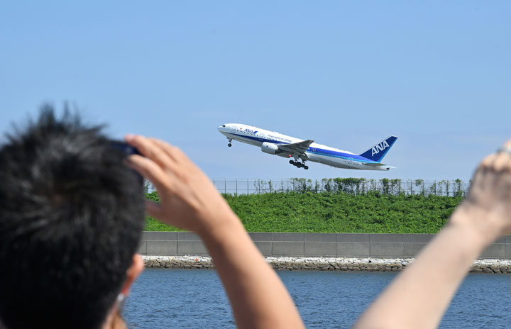 JALの「屋形船de航空教室」の船上から見た羽田空港を離陸するANAの777-200ER=22年9月3日 PHOTO: Tadayuki YOSHIKAWA/Aviation Wire