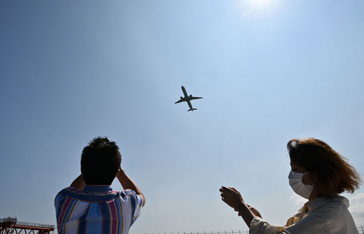 JALの「屋形船de航空教室」の船上から見た羽田空港D滑走路の離陸機=22年9月3日 PHOTO: Tadayuki YOSHIKAWA/Aviation Wire