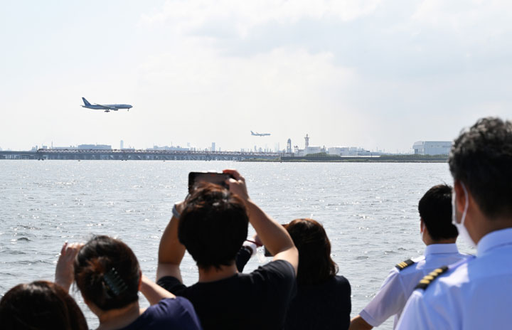 「屋形船de航空教室」の船上から見た羽田空港に着陸するANAの777(手前)とJALの767=22年9月3日 PHOTO: Tadayuki YOSHIKAWA/Aviation Wire