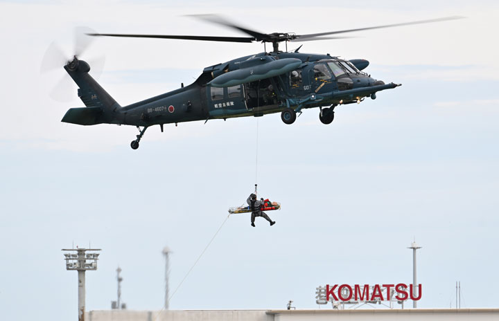 小松基地航空祭で披露した訓練飛行で要救助者をUH-60Jで救助する小松救難隊の隊員=22年9月19日 PHOTO: Tadayuki YOSHIKAWA/Aviation Wire