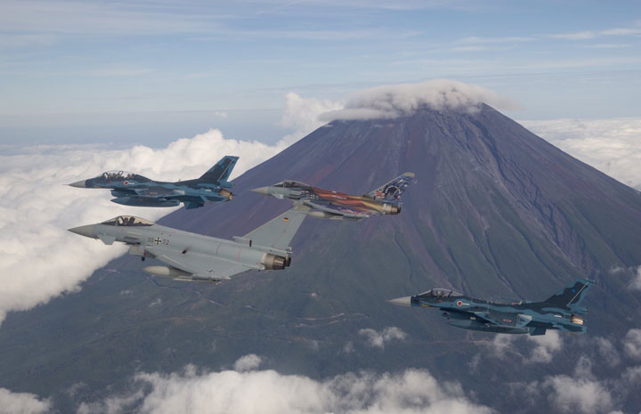 富士山上空でゲルハルツ中将が搭乗するユーロファイター2000と僚機を出迎える井筒航空幕僚長が乗ったF-2(航空自衛隊提供)