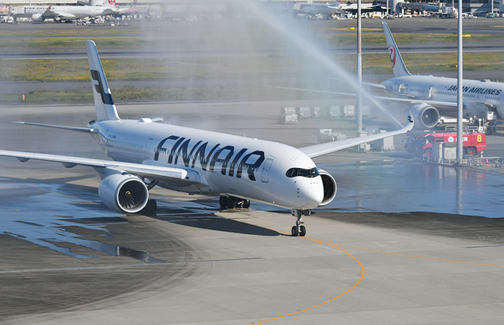 羽田空港へ着陸し放水アーチの歓迎を受け駐機場へ向かうフィンエアーのヘルシンキ発AY61便初便=22年10月31日 PHOTO: Yusuke KOHASE/Aviation Wire