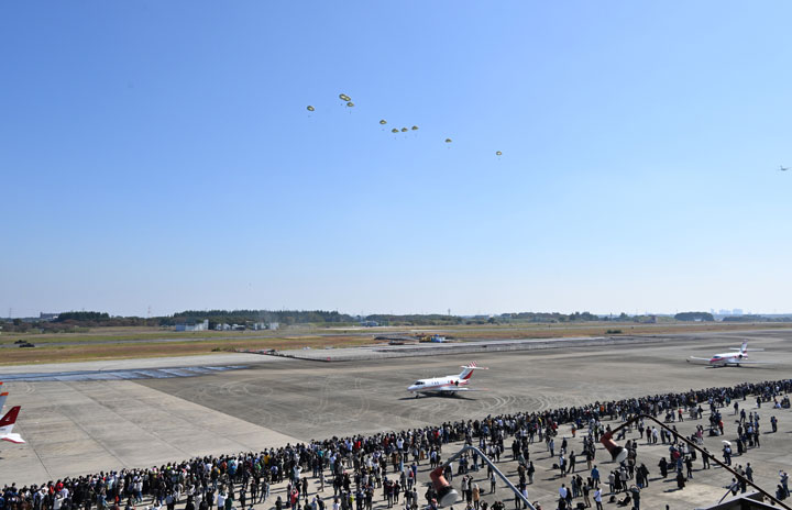 入間航空祭で展示飛行するC-1から降下する空挺部隊=22年11月3日 PHOTO: Tadayuki YOSHIKAWA/Aviation Wire