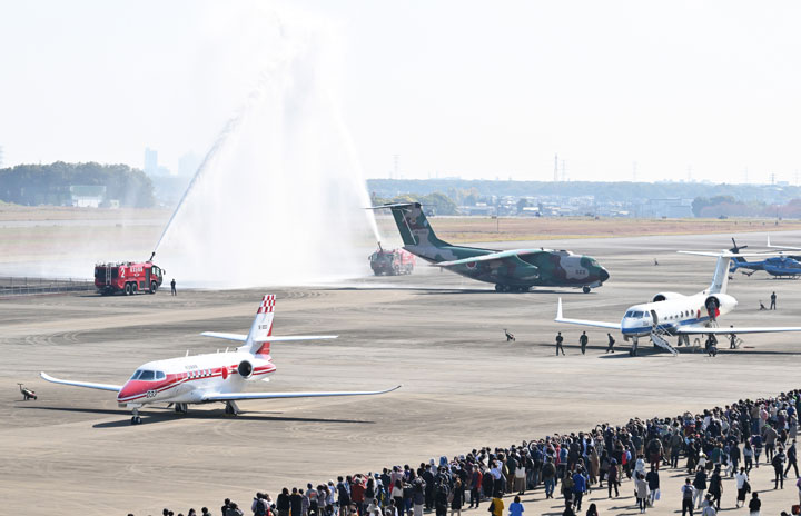 入間航空祭の展示飛行がラストフライトになり放水アーチの歓迎を受けるC-1の29号機=22年11月3日 PHOTO: Tadayuki YOSHIKAWA/Aviation Wire