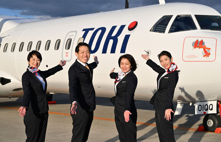 新潟空港に到着したトキエアのATR72-600初号機を紹介する客室乗務員たち=22年11月5日 PHOTO: Tadayuki YOSHIKAWA/Aviation Wire
