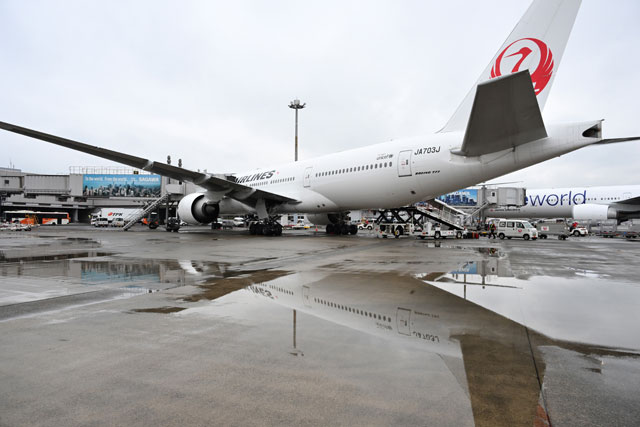 羽田空港の8番スポットへ到着したJALの777-200ER JA703J(手前)と7番スポットに駐機中の777-300ER JA732J=23年11月12日 PHOTO: Tadayuki YOSHIKAWA/Aviation Wire