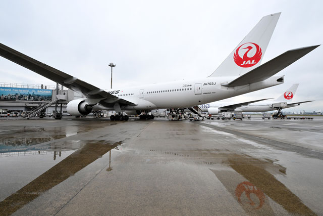 羽田空港の8番スポットへ到着したJALの777-200ER JA703J(手前)と7番スポットに駐機中の777-300ER JA732J=23年11月12日 PHOTO: Tadayuki YOSHIKAWA/Aviation Wire