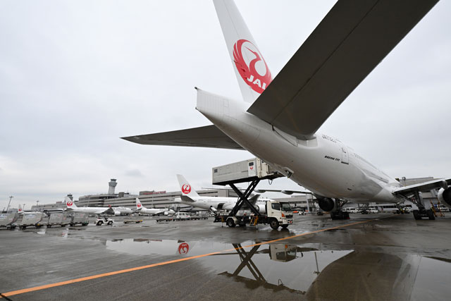 羽田空港の7番スポットに駐機中の777-300ER JA732J(手前)と8番スポットへ到着したJALの777-200ER JA703J=23年11月12日 PHOTO: Tadayuki YOSHIKAWA/Aviation Wire
