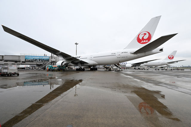 羽田空港の8番スポットへ到着したJALの777-200ER JA703J(手前)と7番スポットに駐機中の777-300ER JA732J=23年11月12日 PHOTO: Tadayuki YOSHIKAWA/Aviation Wire