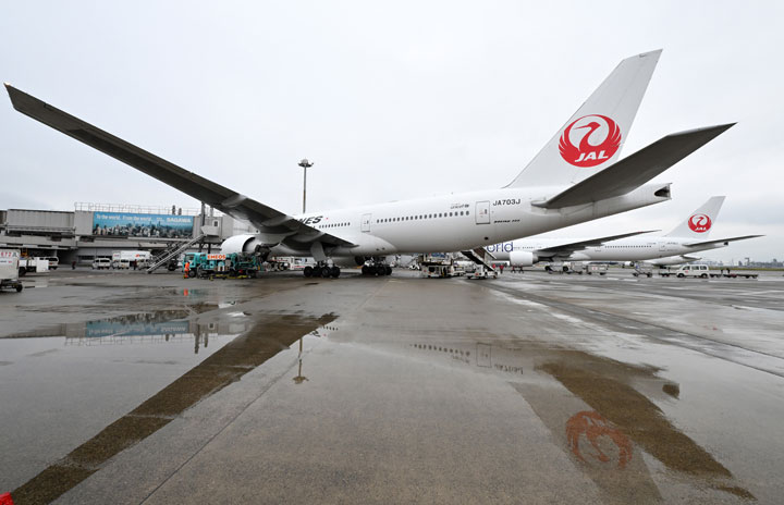 羽田空港の8番スポットへ到着したJALの777-200ER JA703J(手前)と7番スポットに駐機中の777-300ER JA732J=23年11月12日 PHOTO: Tadayuki YOSHIKAWA/Aviation Wire