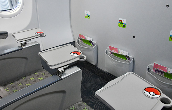 ソラシド初の全面塗装機となる「ナッシージェット宮崎」の機内で1列目のみ立体感のあるものに仕上げたテーブルのモンスターボール=23年3月2日 PHOTO: Yusuke KOHASE/Aviation Wire