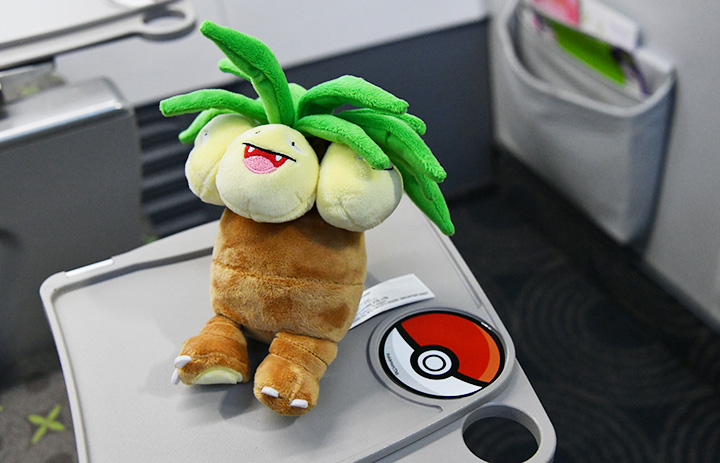ソラシド初の全面塗装機となる「ナッシージェット宮崎」の機内で1列目のみ立体感のあるものに仕上げたテーブルのモンスターボール=23年3月2日 PHOTO: Yusuke KOHASE/Aviation Wire