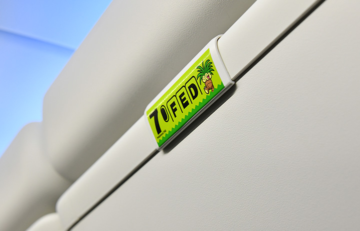 ソラシド初の全面塗装機となる「ナッシージェット宮崎」の機内に備える特別デザインの座席案内表示=23年3月2日 PHOTO: Yusuke KOHASE/Aviation Wire