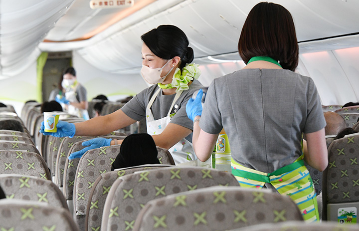 ソラシド初の全面塗装機となる「ナッシージェット宮崎」の機内で飲み物を配る客室乗務員=23年3月2日 PHOTO: Yusuke KOHASE/Aviation Wire