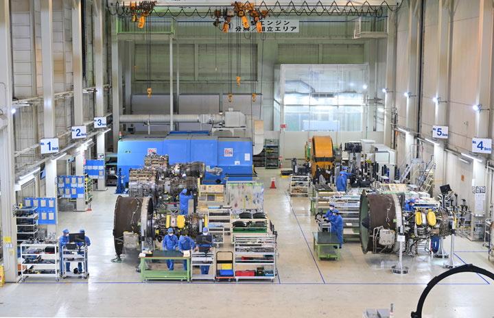 三菱重工航空エンジンの整備工場の既存エリアで整備中のPW1100G-JM(手前)とV2500エンジン=23年3月7日 PHOTO: Tadayuki YOSHIKAWA/Aviation Wire