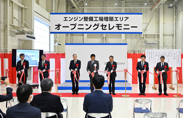 整備工場拡張エリアの完成式典でテープカットする三菱重工航空エンジンの牛田正紀社長ら=23年3月7日 PHOTO: Tadayuki YOSHIKAWA/Aviation Wire