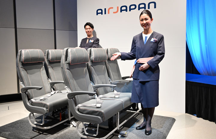 AirJapanのシートを発表する客室乗務員=23年3月9日 PHOTO: Tadayuki YOSHIKAWA/Aviation Wire