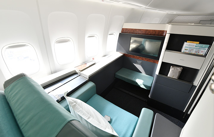 大韓航空の747-8に備えるファーストクラス=23年3月10日 PHOTO: Yusuke KOHASE/Aviation Wire