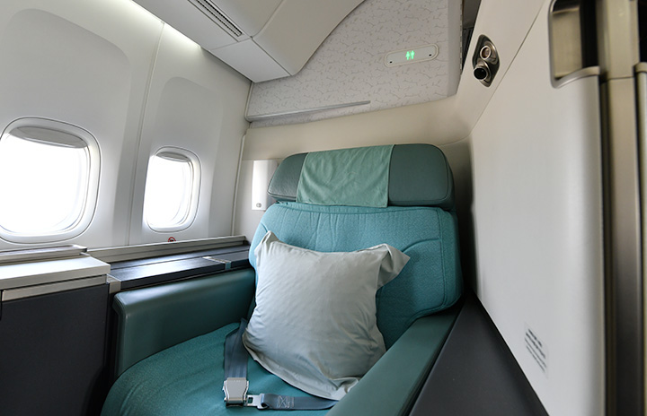 大韓航空の747-8に備えるファーストクラス=23年3月10日 PHOTO: Yusuke KOHASE/Aviation Wire