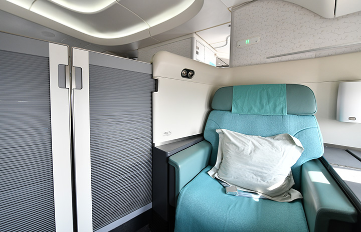 スライドドアを閉め個室状態となる大韓航空の747-8ファーストクラス=23年3月10日 PHOTO: Yusuke KOHASE/Aviation Wire