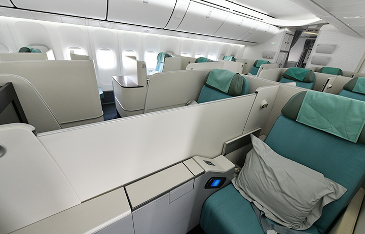 中央席にプライバシーパネルを設ける大韓航空の747-8ビジネスクラス=23年3月10日 PHOTO: Yusuke KOHASE/Aviation Wire