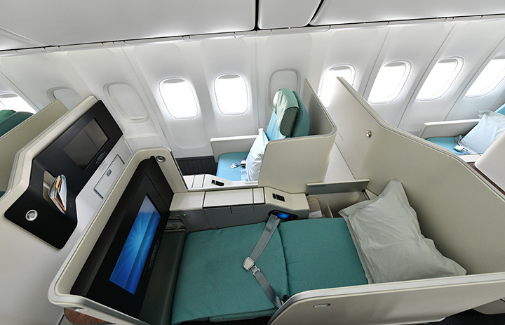 大韓航空の747-8ビジネスクラスに備えるフルフラットシート=23年3月10日 PHOTO: Yusuke KOHASE/Aviation Wire