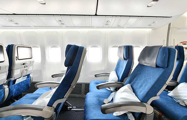リクライニングする大韓航空747-8のエコノミークラス座席=23年3月10日 PHOTO: Yusuke KOHASE/Aviation Wire