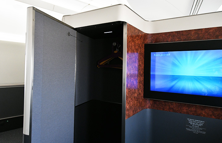 大韓航空の747-8ビジネスクラスに備えるワードローブ=23年3月10日 PHOTO: Yusuke KOHASE/Aviation Wire