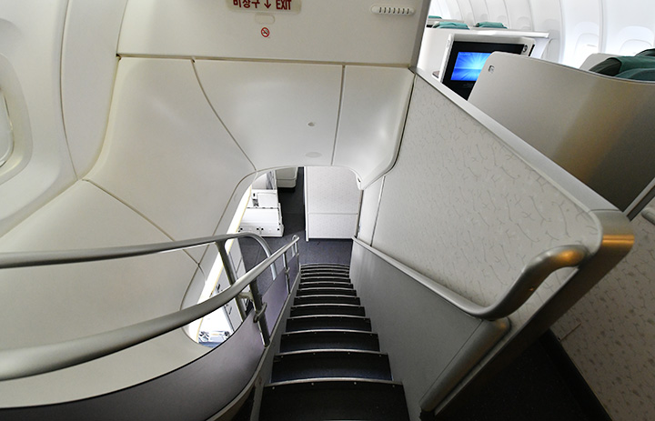 大韓航空の747-8に備えるアッパーデッキとメインデッキをつなぐ階段=23年3月10日 PHOTO: Yusuke KOHASE/Aviation Wire