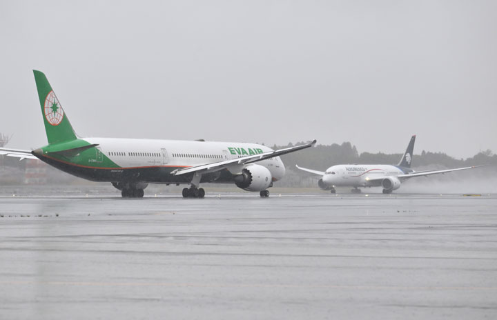 成田空港のA滑走路を離陸するアエロメヒコ航空のメキシコシティ行き再開初便AM57便の787-8(奥)とエバー航空の787-10=23年3月26日 PHOTO: Tadayuki YOSHIKAWA/Aviation Wire