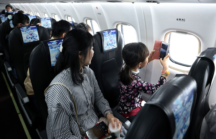 HACの「雪ミク」ラッピング機で札幌上空遊覧フライトを楽しむ参加者=23年3月29日 PHOTO: Kiyoshi OTA/Aviation Wire