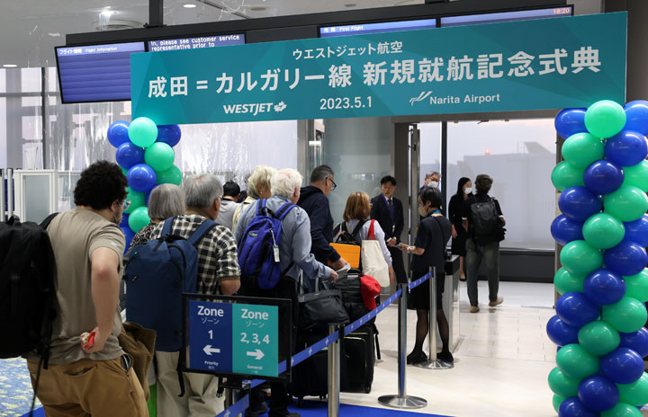 成田空港でウエストジェットのカルガリー行き初便WS81便に搭乗する乗客=23年5月1日 PHOTO: Kiyoshi OTA/Aviation Wire