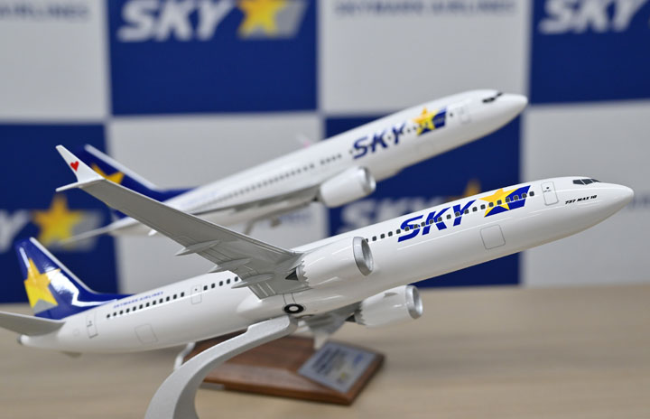 スカイマークが導入する737-10(手前)と737-8の模型=23年5月15日 PHOTO: Tadayuki YOSHIKAWA/Aviation Wire