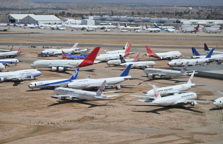 JALの777-200ER初号機JA701J退役チャーターでローパスするビクタービル空港=23年5月16日 PHOTO: Tadayuki YOSHIKAWA/Aviation Wire