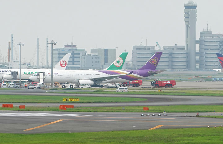 エバー航空BR189便(左から2機目)と接触したタイ国際航空TG683便(同3機目)=23年6月10日 PHOTO: Tadayuki YOSHIKAWA/Aviation Wire