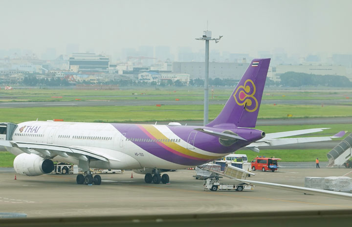 エバー航空BR189便と接触し右主翼端のウイングレットが破損したタイ国際航空TG683便のA330=23年6月10日 PHOTO: Tadayuki YOSHIKAWA/Aviation Wire