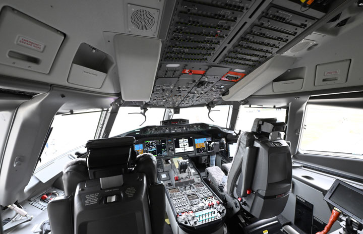 パリ航空ショーで公開された777-9飛行試験機のコックピット=23年6月18日 PHOTO: Tadayuki YOSHIKAWA/Aviation Wire