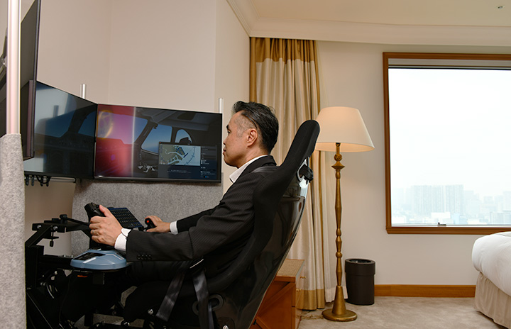JALとのコラボルーム「JAL FLIGHT & RED SUITE」に設置するフライトシミュレーター「X-Plane 12」を操作するグランドニッコー東京 台場の担当者=23年6月27日 PHOTO: Yusuke KOHASE/Aviation Wire