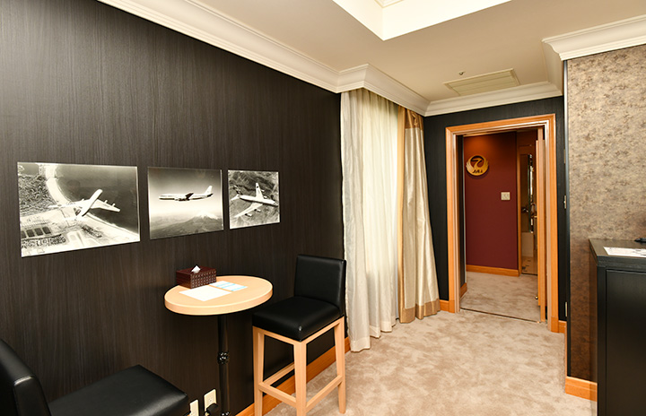 JALのコンベア880型機の写真を飾るグランドニッコー東京に新設するコラボルーム「JAL FLIGHT & RED SUITE」のリビングルーム=23年6月27日 PHOTO: Yusuke KOHASE/Aviation Wire