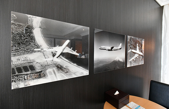 グランドニッコー東京に新設するコラボルーム「JAL FLIGHT & RED SUITE」のリビングルームに飾るJALのコンベア880型機の写真=23年6月27日 PHOTO: Yusuke KOHASE/Aviation Wire